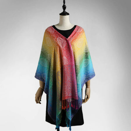 Les couleurs vibrantes et les motifs dégradés de l'écharpe créent une ambiance apaisante et élégante, parfaite pour toute occasion. Vous serez toujours en parfaite harmonie avec la nature et la mode.